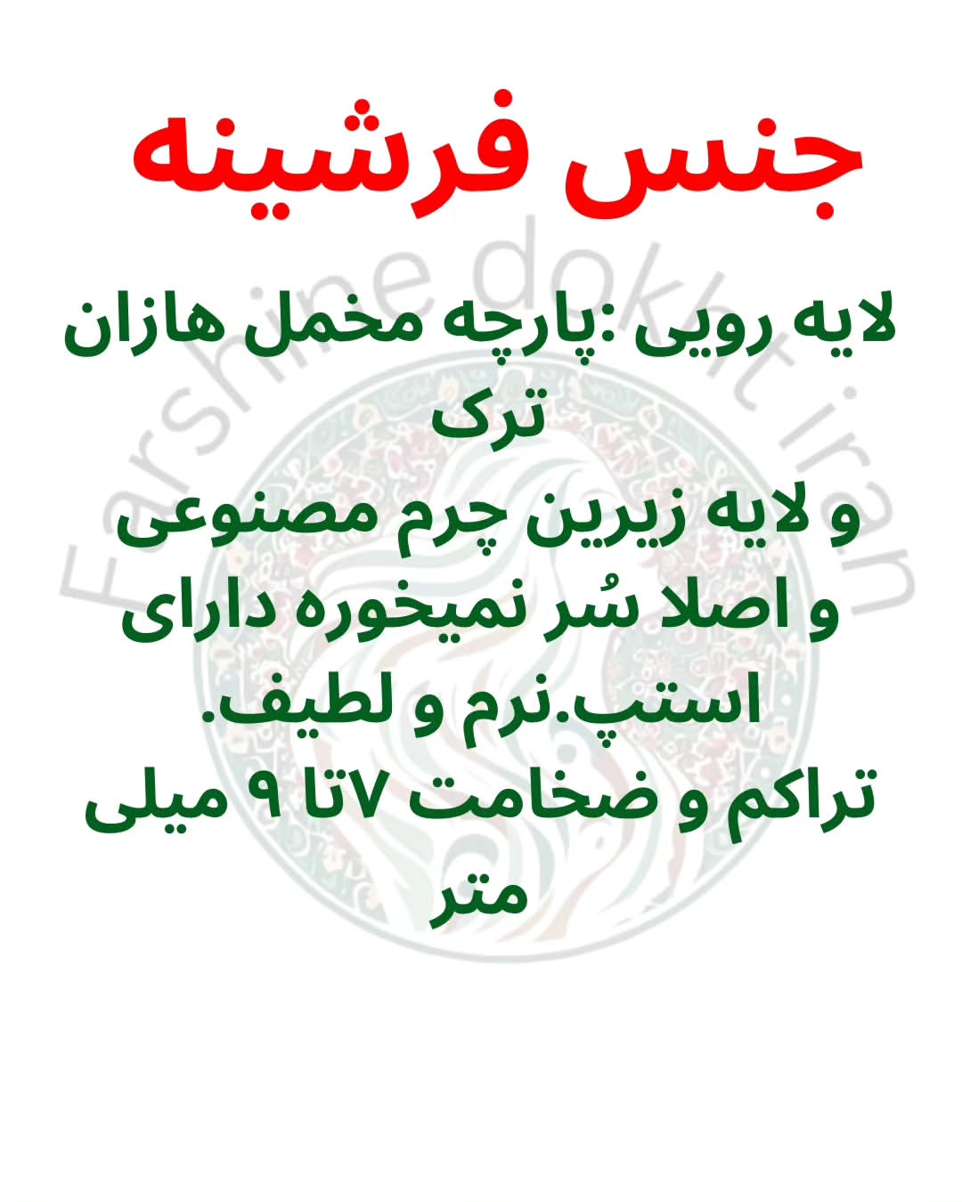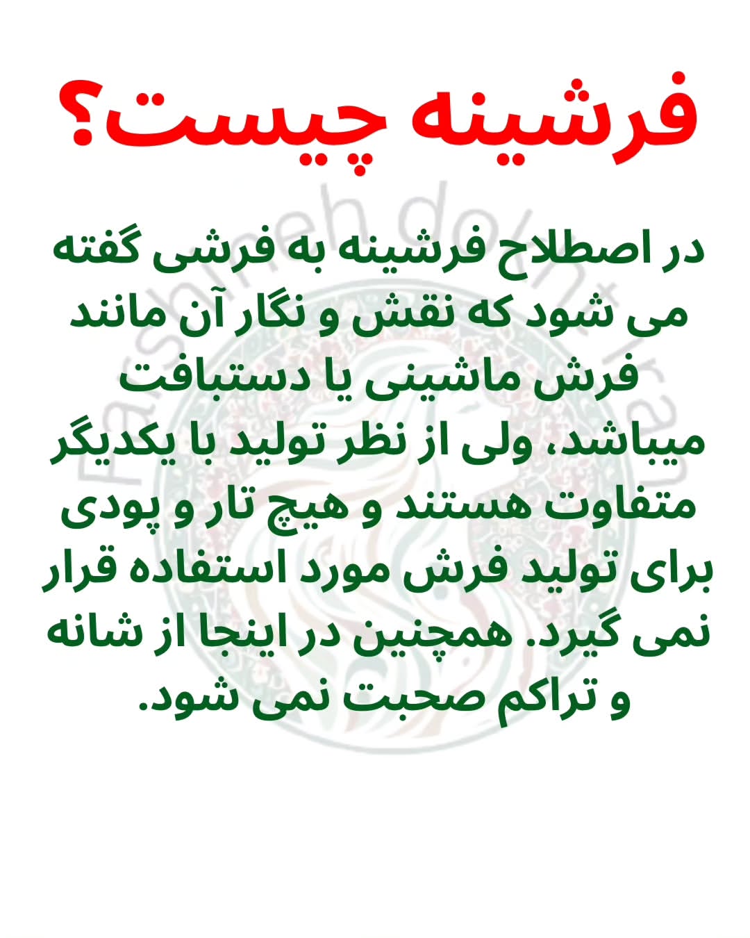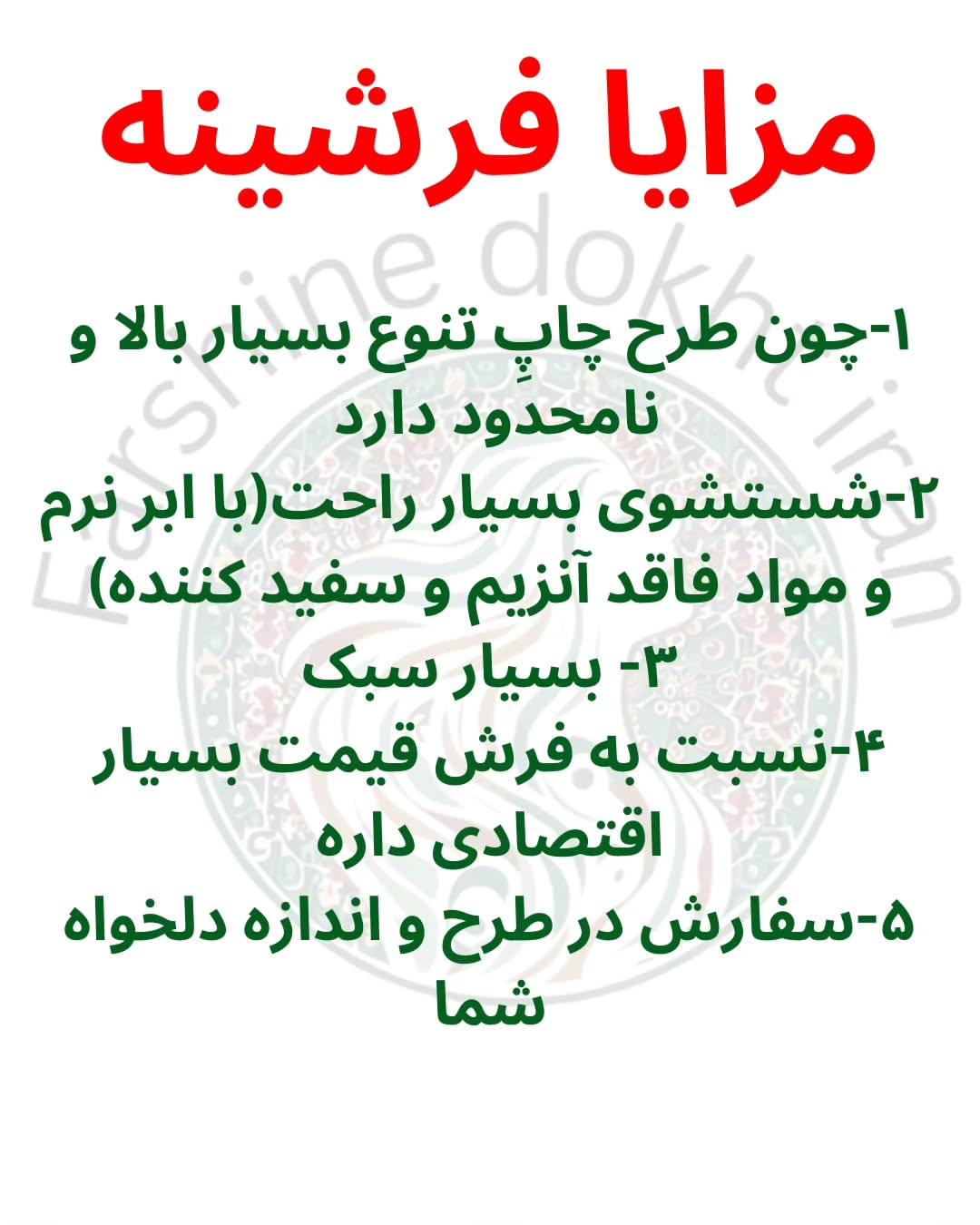 فرشینه فاقد تار و پود، با طرح چاپی و تنوع بسیار بالا. شستشوی بسیار راحت و سبک. نسبت به فرش بسیار اقتصادی.